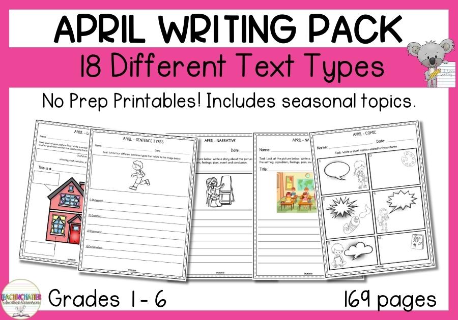 April Writing Pack: Cover your month with 18 text types, creative activities, and seasonal prompts, all in a no-prep 169-page printable. Ideal for teachers, relief staff, or homeschooling, this resource includes narrative, opinion, persuasive, report, procedural, and journal writing plus essential tools like planning pages, student goals, rubrics, and checklists. For grades 1-6, with differentiated support options. Perfect for time-saving and skill-building!