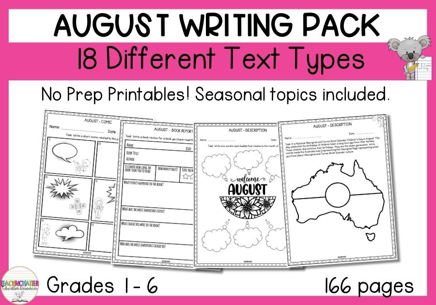 Need engaging writing topics? Grab this 166-page PDF pack featuring 18 text types and differentiated options—ideal for busy teachers or relief staff. With seasonal themes like Book Week and National Aboriginal and Torres Strait Islander Children's Day, it includes teacher planning pages, student goals, sentence work, narratives, essays, and checklists. Perfect for classrooms or homeschooling, with adaptations for Northern and Southern Hemisphere schools.
