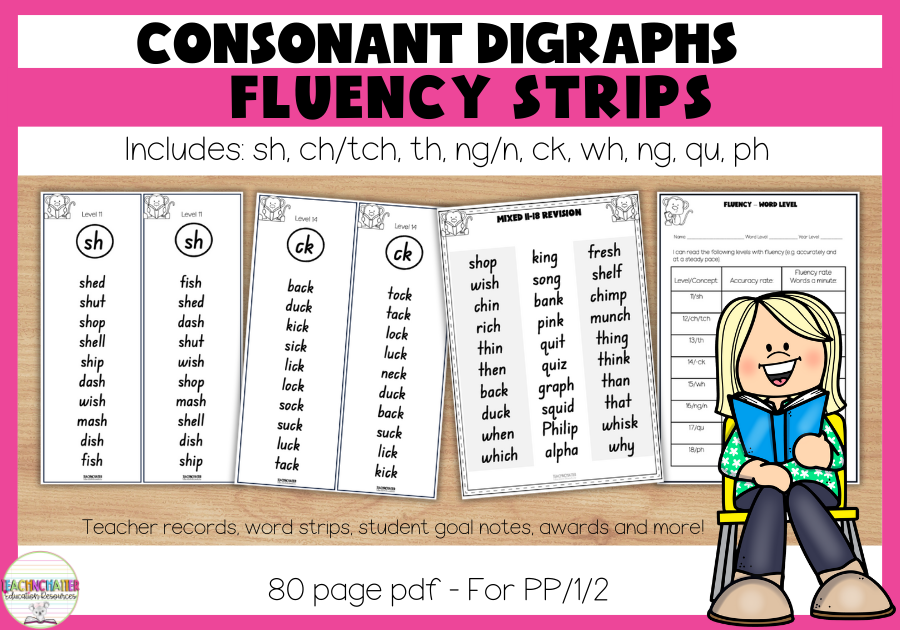 Build decoding automaticity with these Consonant Digraph Phonics Word Reading Fluency Strips. 80-page print-and-go PDF includes sh, ch/tch, th, ck, wh, ng/n, qu and ph. Each strip has 10 words (2 per A4 page), plus mixed lists, editable strips, word lists, teacher records, checklists, student goals and awards. Ideal for early readers and intervention. Use these as centre activities, whole class reading or send home!