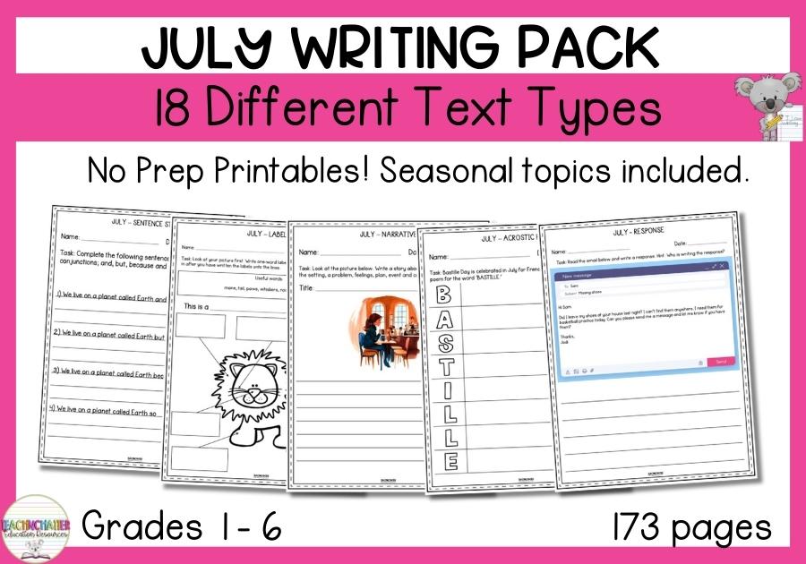 Feeling worn out in July? Simplify your planning with this 173-page no-prep printable pack featuring 18 differentiated text types and additional creative activities. Ideal for busy teachers, relief staff, or homeschooling. Includes seasonal topics like Bastille Day, 4th of July, and NAIDOC Week. Key components: teacher planning pages, student goals, narrative prompts, opinion writing, checklists, and templates.