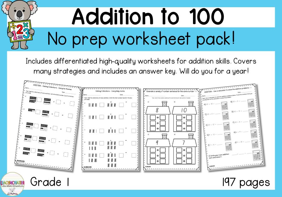 A no prep 197-page pack has everything you need, including an answer key to save you time. With differentiated options and multiple strategies like counting on, using a 100s chart, and more, these worksheets target key addition skills. Activities include vertical/horizontal problems, number stories, partitioning, missing addends, and adding 0, 10, and 20.