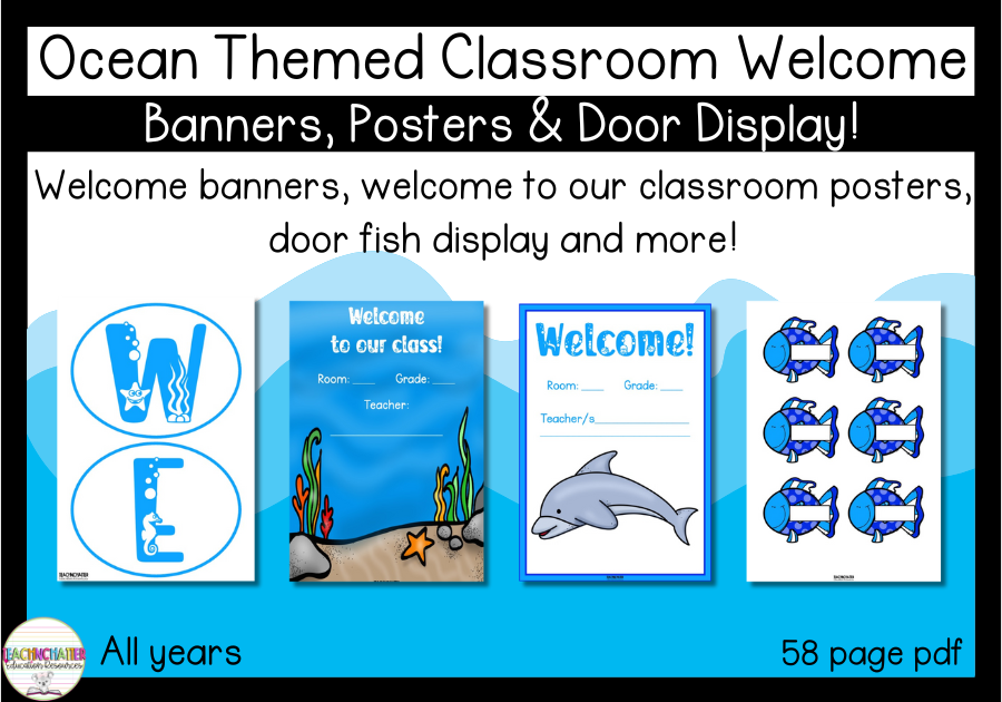 Ocean-Themed Welcome Posters & Door Display (58-Page PDF) - Transform your classroom with this ocean-themed pack! It includes welcome banners, beautiful classroom posters, and a customisable door fish display to personalize with student names. Perfect for doors, walls, and bulletin boards, this resource creates a welcoming space that inspires learning. Download, print, and make a splash in your classroom today!
