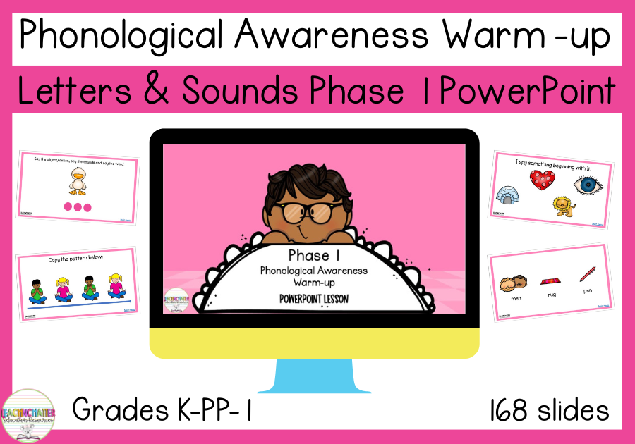 Letters and Sounds Phase 1 Phonological Awareness Warm-up PowerPoint: Make phonological awareness practice fun and effortless! This 168-slide PowerPoint is perfect for daily warm-ups or targeted revision. Includes; environmental sounds, rhyme, alliteration, blending, segmenting and more. Includes sound buttons and self-checking slides. No need to follow Letters & Sounds—great for any phonics program!