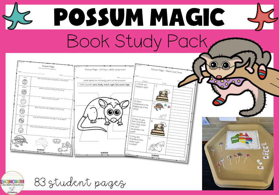 Possum Magic Comprehension Book Pack – Teach comprehension with ease using this engaging unit for Possum Magic by Mem Fox. Perfect for Kindergarten to Year 2, including comprehension questions, writing tasks, story sequencing, text-based learning, vocabulary, and more. Fun word search, clozes, and matching. Print-and-go format. 83 student pages. 188pg total. For teachers, home schooling and speech therapists.