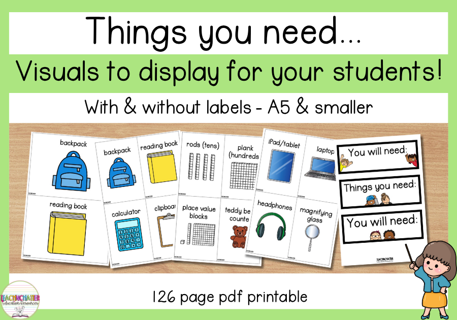 Includes; "Thing we need" labels plus A5 labels without words, A5 labels with words and 4 to an A4 page with labels (words). Examples of resources include; scissors, glue stick, glue pot, lead pencil, markers/textas, whiteboard, colouring in pencils, ruler, subject books, backpack, library bag, water bottle, snack, lunch box, crunch & sip, counters, place value blocks, timer, headphones, iPad/tablet, laptop, crayons, paint easel, paint brush, permanent markers, book, whiteboard markers, whiteboard eraser, eraser, sharpener and more!